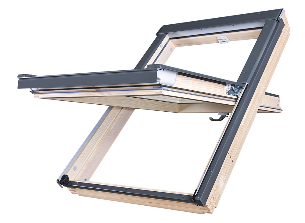 Мансардное окно со среднеповоротным открыванием FAKRO — самая популярная конструкция окна для крыши. Благодаря фрикционным петлям, располагающимся в ее центральной части, створку можно оставлять в позиции наклона, а также поворачивать вокруг оси на 180°, что значительно облегчает мытье внешнего стекла.