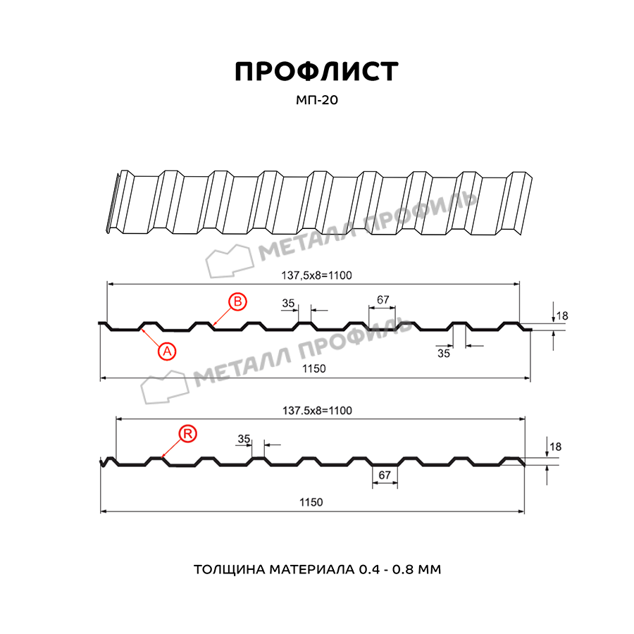 Профиль МП-20 имеет толщину 0,5 мм, что обеспечивает прочность и долговечность материала. Он изготовлен из металла высокого качества, что гарантирует его стойкость к коррозии и воздействию атмосферных условий.